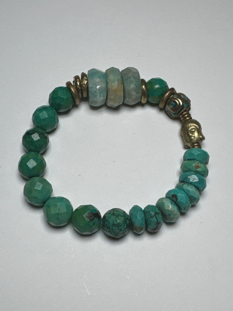 Beautiful Green turquoise, Chrysoprase, gold ethnic and Budha bead stretchy