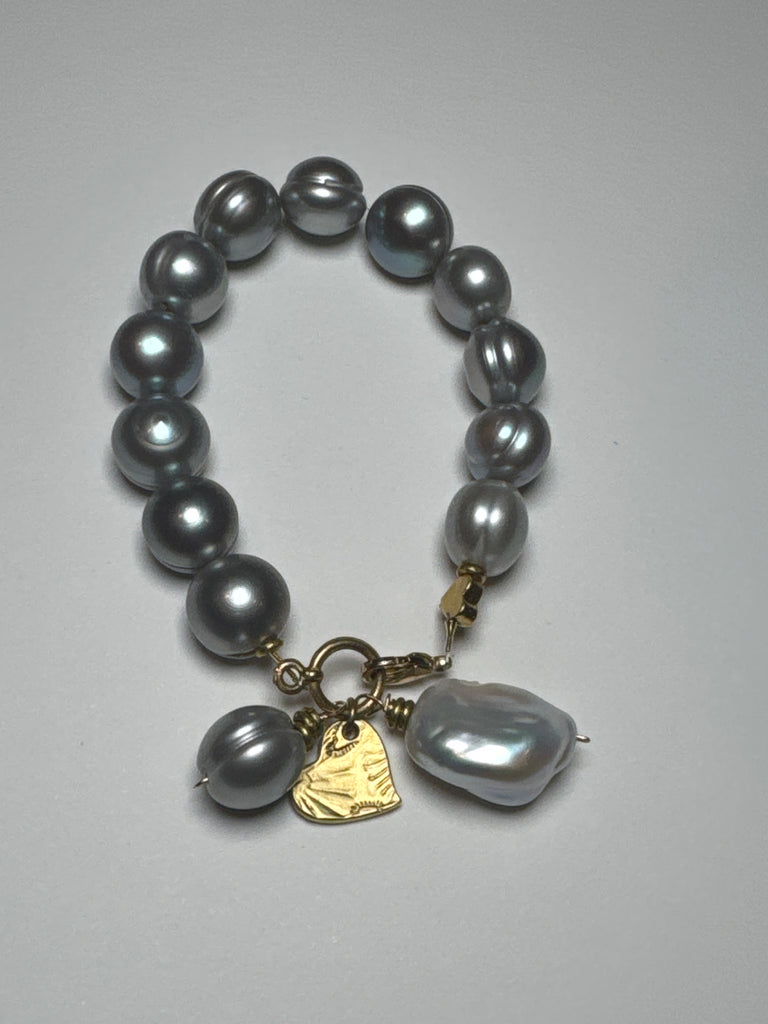 White fresh water pearls, 10-12-mm, extra Large Baroque Pearls, gold Heart and Heart charm, stretchy