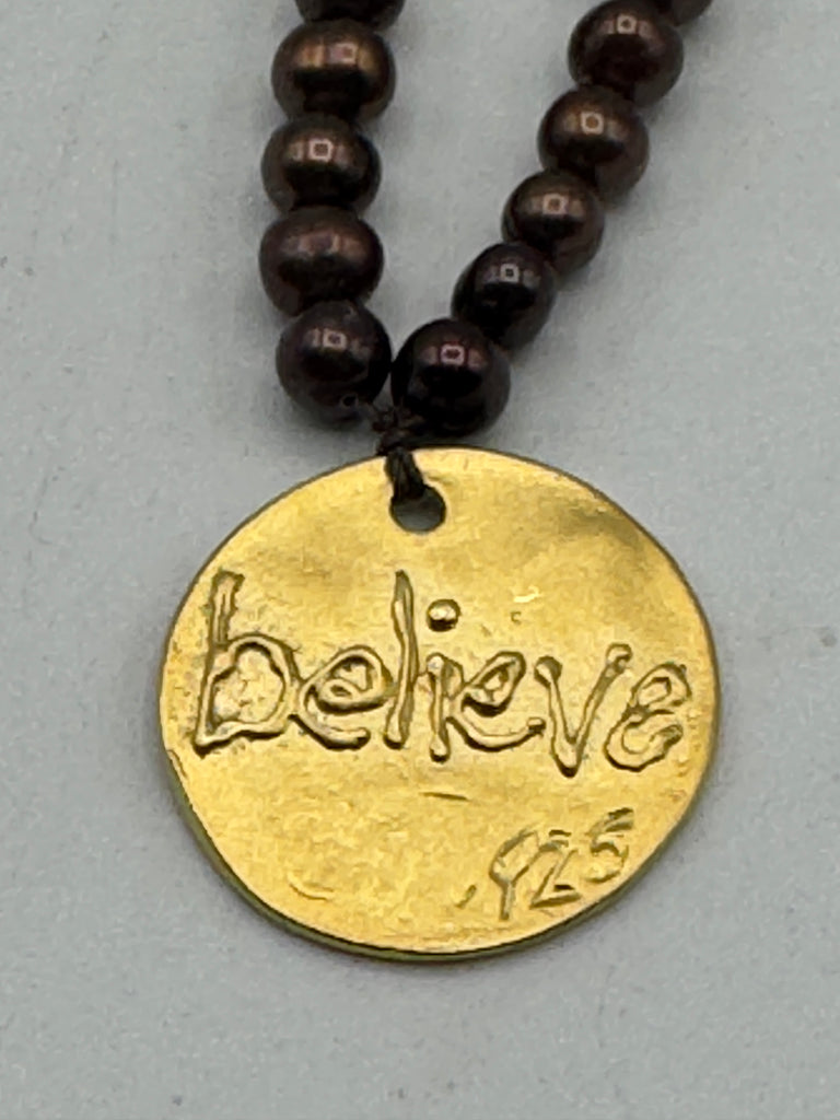 4mm brown fresh water pearls, gold butterfly and Believe medallion