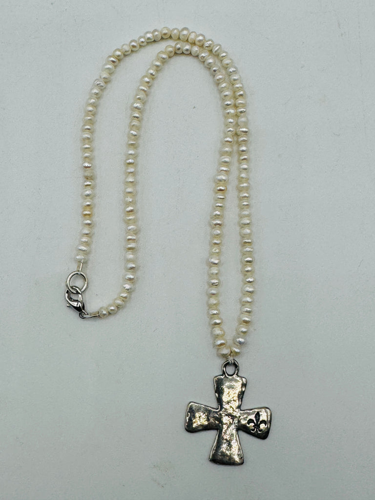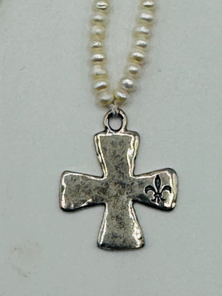 White fresh water pearls 3mm, sterling silver, cross,