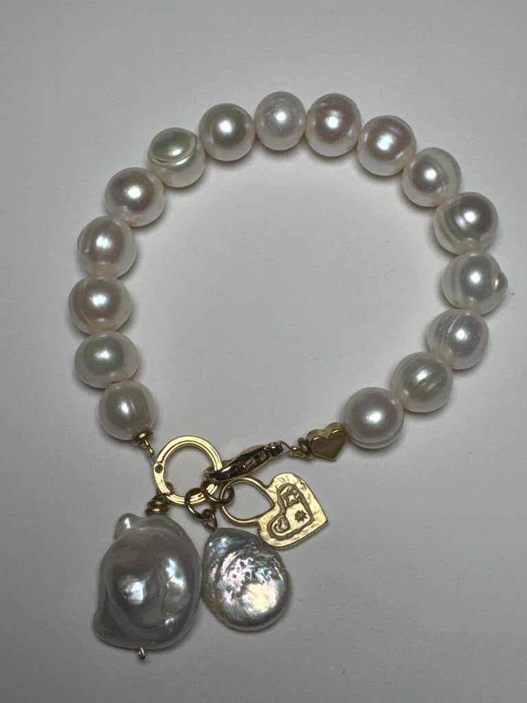 White fresh water pearls, 10-12-mm, extra Large Baroque Pearls, gold Heart charm, stretchy