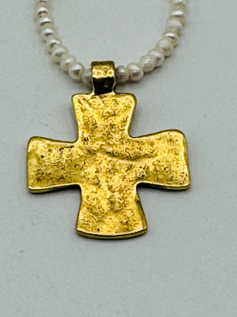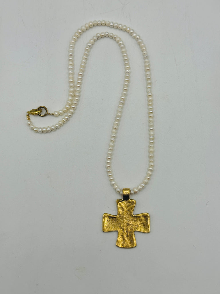 White fresh water pearls, 2-3 mm, gold plated cross, hook clasp.
